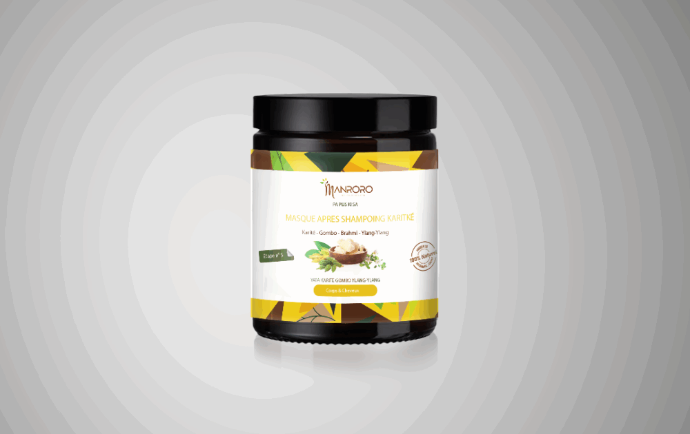 100% naturel. Nourrit, fortifie et répare en profondeur. Démêle et stimule la croissance. Pour cheveux doux et brillants. Karité – Gombo – Brahmi – Ylang-Ylang.