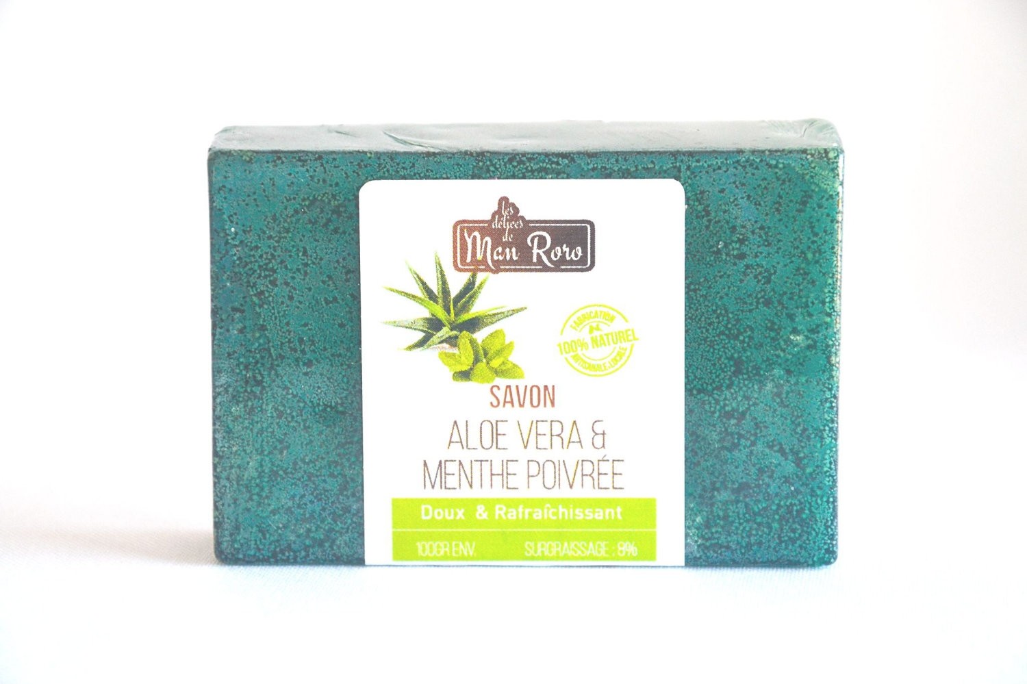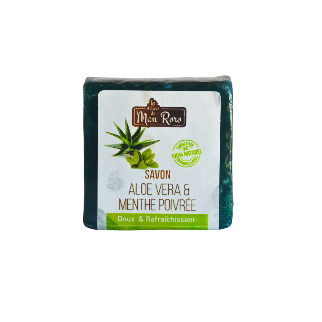 Le savon Aloes menthe poivrée lave et rafraîchit la peau en douceur.