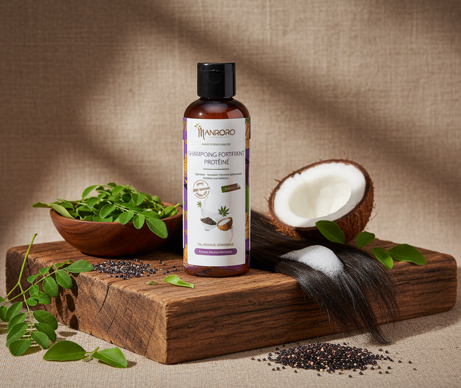 Shampoing fortifiant à la spiruline et kératine végétale. Nettoie en douceur, renforce les cheveux cassants et restructure les boucles. 100 % naturel et revitalisant.